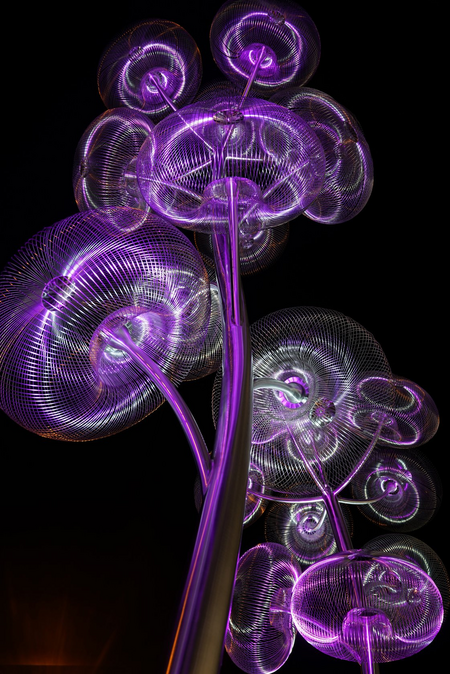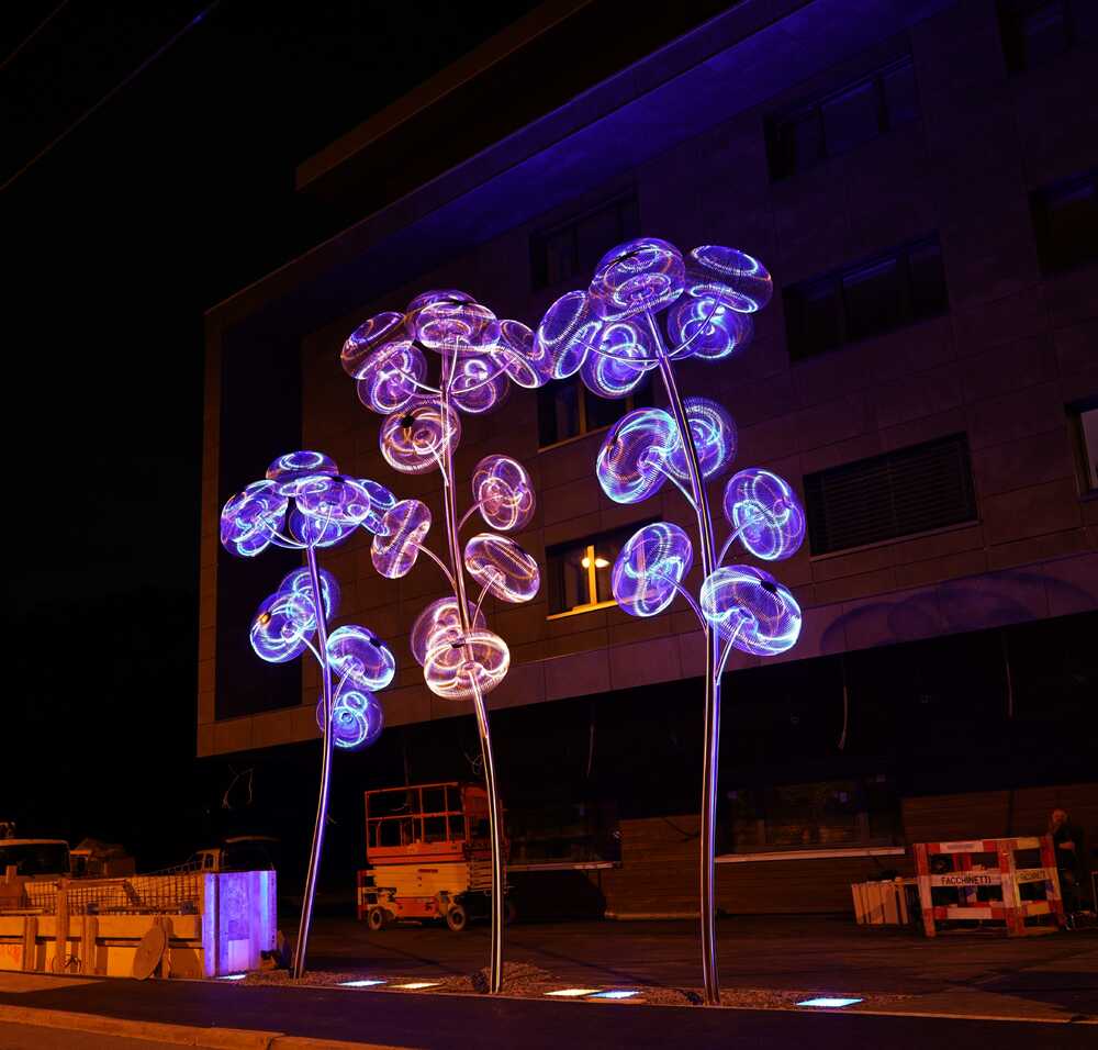 When the sun sets, the dynamic illumination system (RGB LED lamps in light boxes installed in ground + the controller) lets the sculpture undergo a complete metamorphosis and shows its true colors. It’s a great feature in dynamic public places, where lots of people walk.