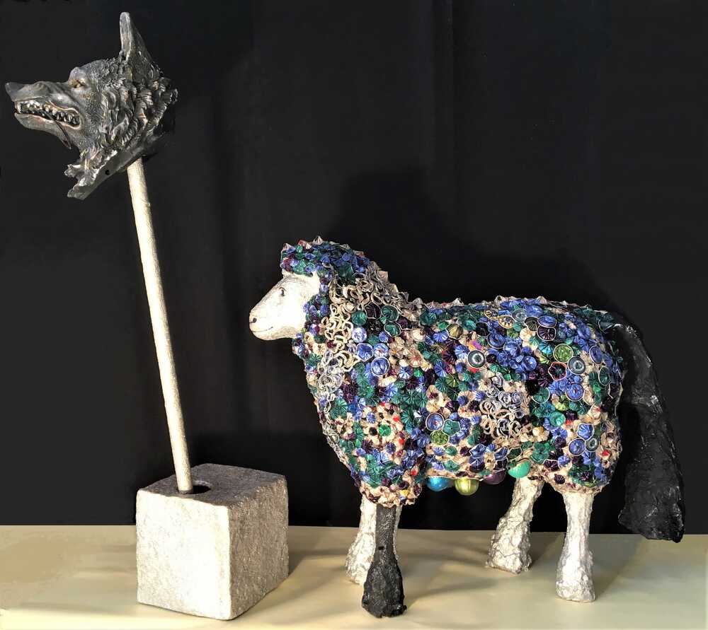 A wolf's head is emblazoned on a silver wooden stick in front of the actual beautifully encapsulated sheep. It reveals its true identity, however, through the wolf's tail, a black leg, a black spot on the back and the many teats.