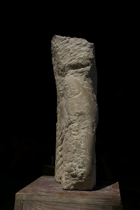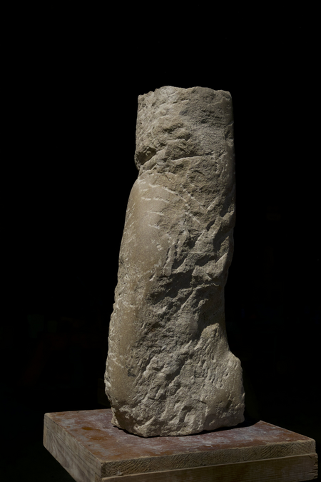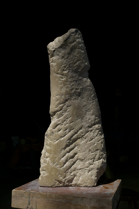 Eine, trotz solider Statik, sehr dynamische Form voller Detailreicher Spannung ergeben ein abstraktes, skulpturales Objekt in ausgewogener Balance. Das Material, ein heller Kalkstein, kommt mit seinen angenehmen visuellen und haptischen Eigenschaften zu angemessener Präsenz. Die Assoziation eines Torso drängt sich auf, ist aber tatsächlich mehr Ausgangspunkt als Absicht dieser Gestaltung. Brechungen, quasi Verletzungen, Abbrüche und Einschnitte prägen den Eindruck.