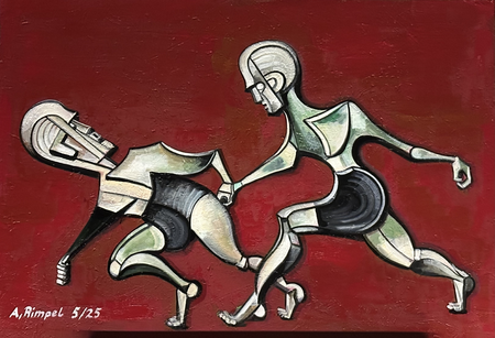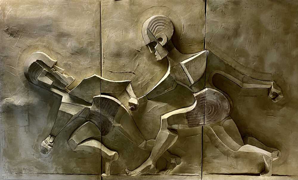 Kubistisches Wandrelief für den Vorraum einer Sport und Kulturhalle. Das Foto zeigt ein 1:1 Gipsmodell und eine Studie in Öl auf Holz