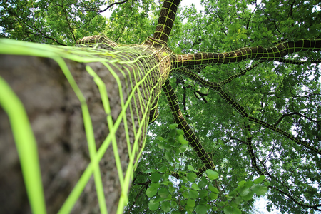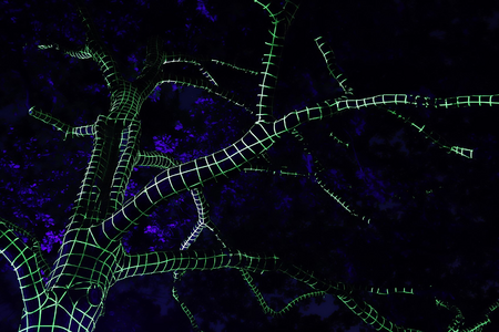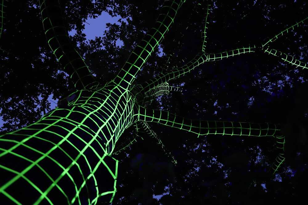 Der Baum im Skulpturenpark ist mit einem Raster aus Neontape beklebt. Selbst am Tage wirkt er wie ein digitaler Fremdkörper. Verschwinden dann am Abend die Farben des Parks in der Dunkelheit, erscheint der mit UV-Licht beleuchtete Baum wie ein Computer-generiertes Hologramm.