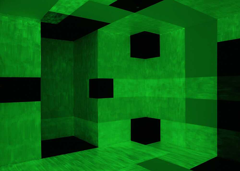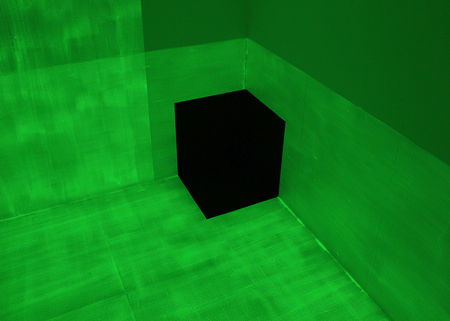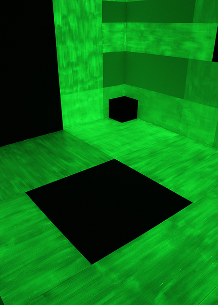 Der Raum wurde mit nachleuchtender und schwarzer Farbe gestrichen. Im matten schattenfreien Licht lässt die Wahrnehmung die schwarzen Farbflächen als feste Körper oder Wand- bzw. Bodenöffnungen erscheinen.