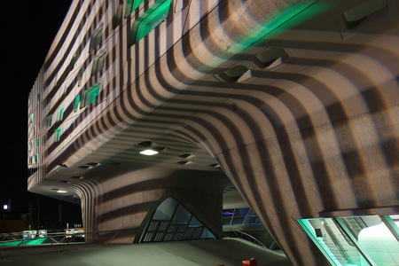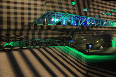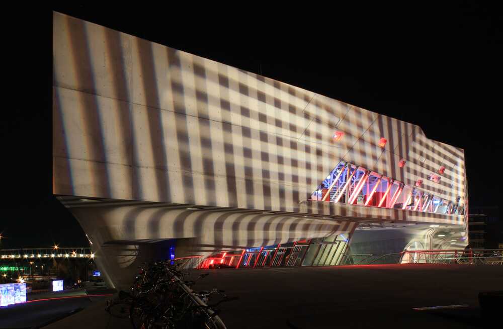 Das „Phaeno“ in Wolfsburg gehört zu den wohl spektakulärsten Architekturen der Region. Bauten von Zaha Hadid galten in den 80er Jahren noch als unbaubar. Die auf sogenannten „Cones“ ruhenden Formen dieses Bauwerks beschreiben eine stark geschwungene Ästhetik. Diese beginnt sich durch die Projektion des Hell-Dunkel-Rasters aufzulösen.