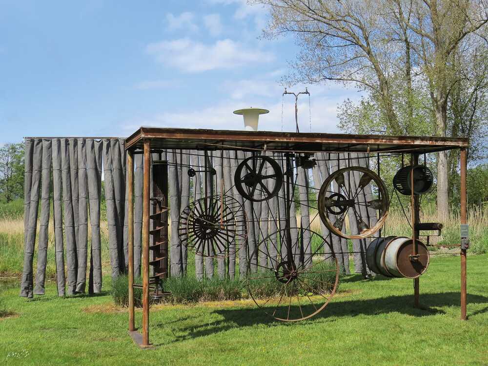Ganz große Bühne – kleiner StrahlDiese Außeninstallation mit Straßenlaterne steht im Freien und bietet einem dezenten „Wasserspiel“ eine ganz große Bühne: Oberhalb eines grafisch aufeinander abgestimmten kinetischen Gefüges aus Walzen, Spirale, Korb, Fass, Radialventilator, Speichenrädern und einer Traktorfelge gleitet ein Zwillingshahn auf und ab und speit dabei kontinuierlich Wasser.