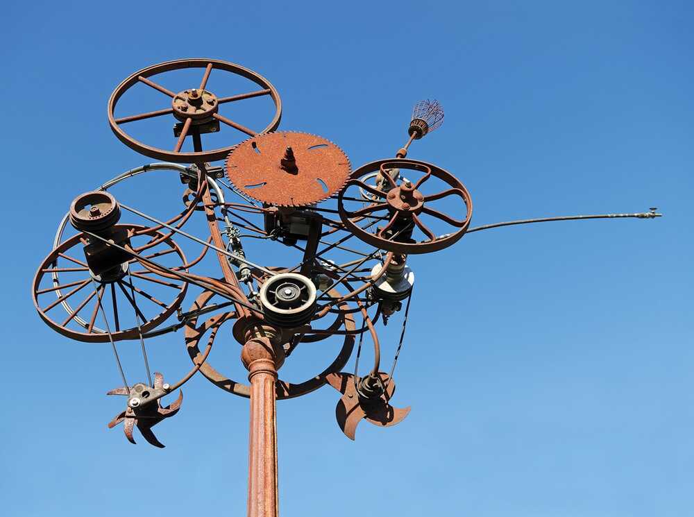 Aus vielgestaltigen Rädern, Sägeblatt, Schneebesen und den Fräsmessern beziehungsweise Hacksternen aus einer Bodenfräse ist dieses Wasserspiel komponiert. Den Standfuß bildet die kannellierte Säule eines gusseisernen Laternenmastes. Durch einen langen Ausleger aus Kupferrohr, der über eine exzentrische Bewegung gesteuert kreiselnd horizontal vor und zurück gleitet, spritzt nach vorne bogenförmig ein Wasserstrahl heraus.