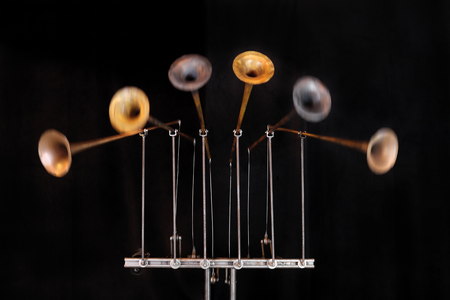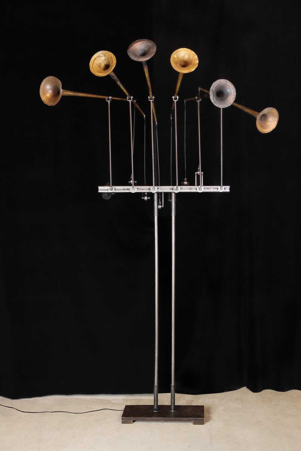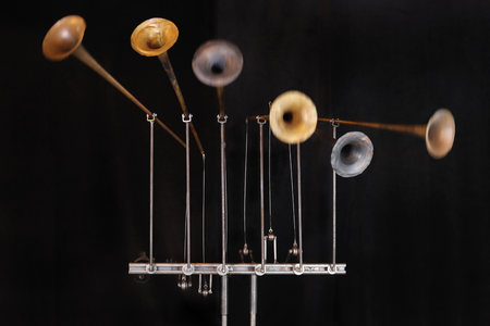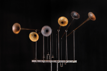 Die Trichter bewegen sich mit sanften Übergängen wellenförmig, zeichnen flüchtige Sinuskurven in die Luft und je nach Beleuchtung faszinierende Schatten an Wand und Decke. Gesteuert werden diese zyklisch wiederkehrenden Bogenformen durch eine entsprechend konstruierte Kurbelwelle.