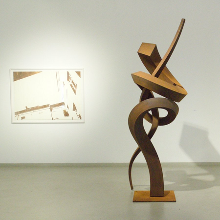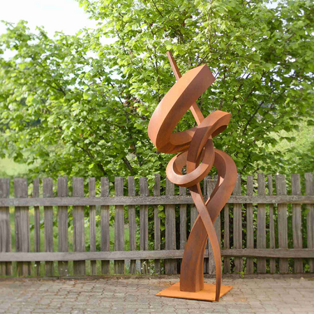 Die keilförmigen, zu beiden Enden sich vergrößernden Querschnitte der ineinander verschlungenen Skulptur treten durch ihre Formgebung in einen Dialog. Reduziert auf klare, abstrahierte Formen lädt das Werke dazu ein, die durch Licht und Schatten akzentuierten Bögen, Verdrehungen und Rundungen auf sich wirken zulassen und dabei zu eigenen Interpretationen zu gelangen. Die geschmeidige Kontur evoziert Leichtigkeit, der jedoch die zähe Härte des verwendeten Stahls diametral entgegensteht. Unterstrichen wird dieser Eindruck durch die edel wirkende oxidierte Oberfläche der im Innen- als auch im Außenbereich positionierbaren Skulptur.