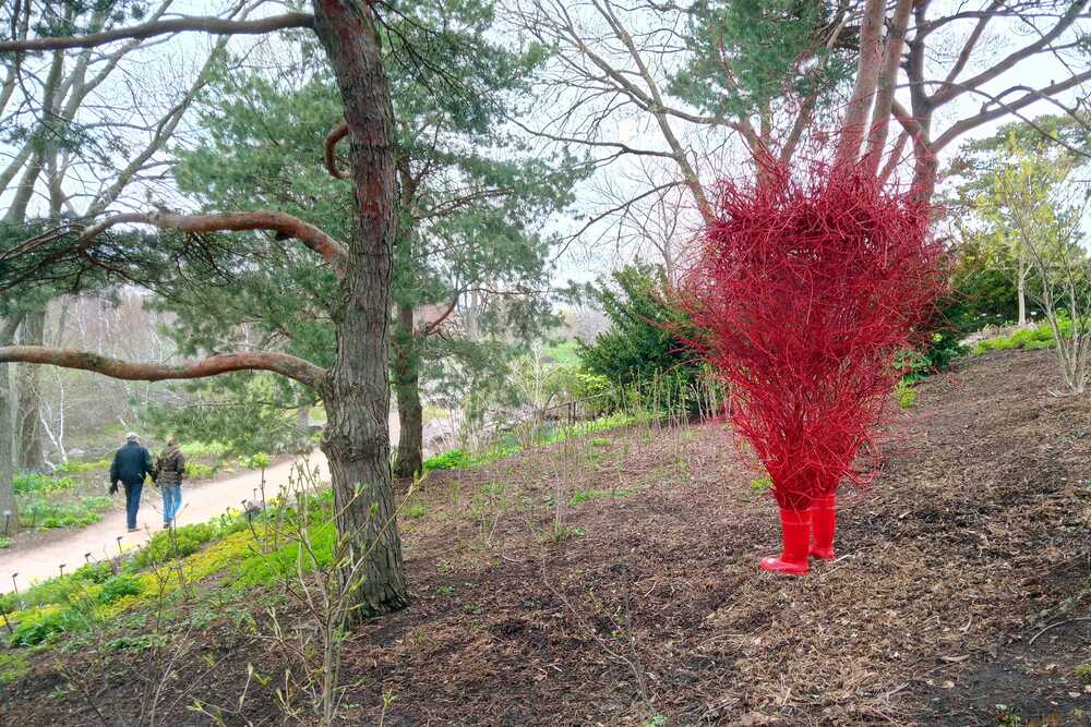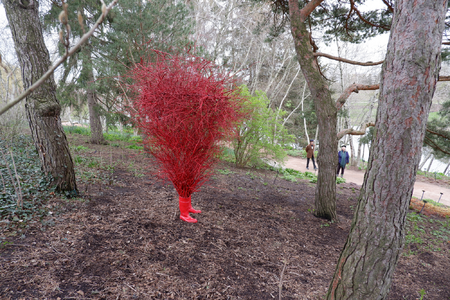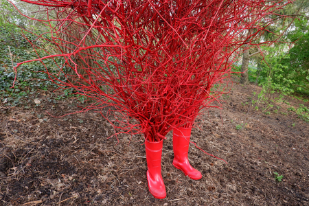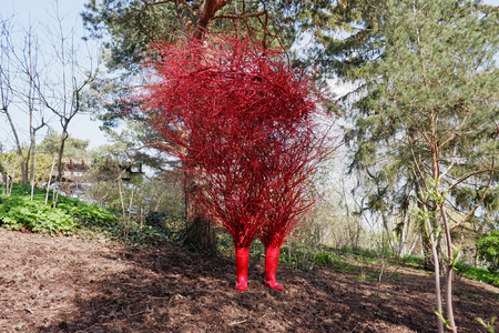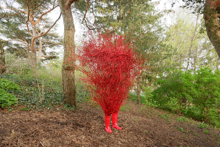 Material: rubber boots, twigs, paint, metal, steel cable