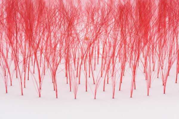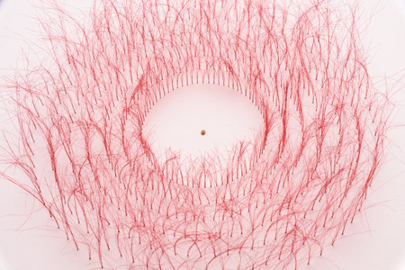Gefärbte Menschenhaare, Senfkorn auf Fotokarton auf MDF-Platte