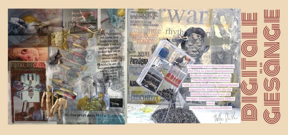 Two collages that build on each other to show our relationship to digital technology and the coming bio-technology. Inherent in both is the merciless clarity of the algorithm and the thought that everything dissolves into bits, becomes a bit mush, in the second machine age.