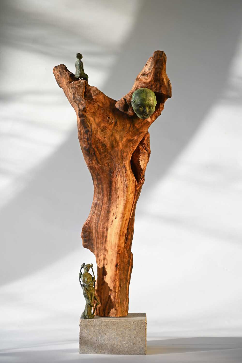 This sculpture in wood and broze shows the tree of life . Firmly rooted in the earth and strettching its branches in the air . it shows two faces . One is laughing and one is crying. All emotions are part of our lives . The woman in the base is a real nature woman and gathered wisdom in her life. Life sprouts from her.The girl above on a branch sees everything and concludes it is not any more necesarry to get mixed up in the highs and lows of emotions.She is free