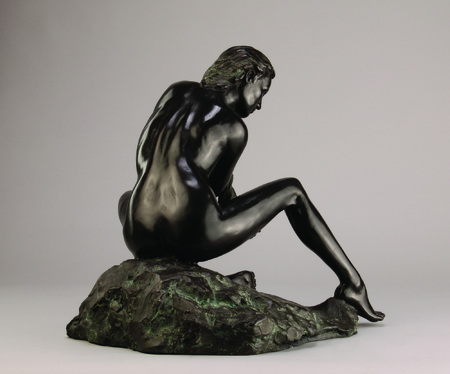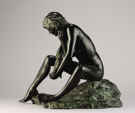 From the back the figure is seen with a beautifully curving spine that compliments the slope of the shoulders and the opposing contra-posto position of the hips. Viewed from the front the lack of modesty in her seated position introduces a vulnerability that embellishes her fragile introspective nature.