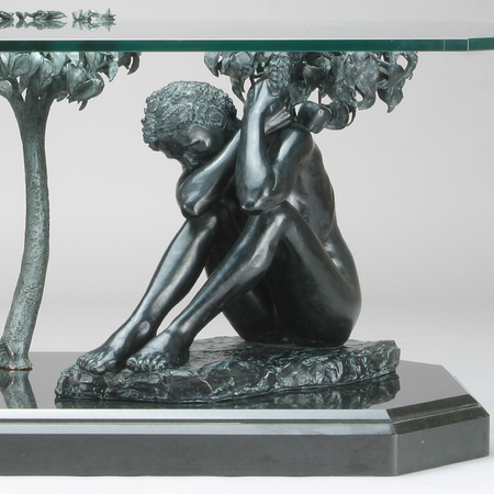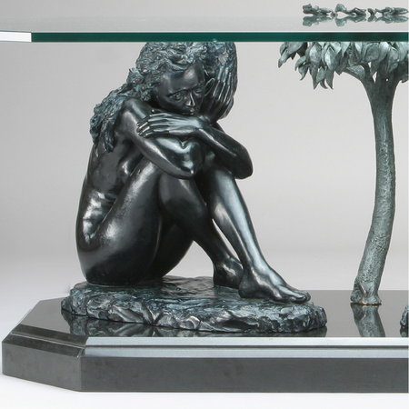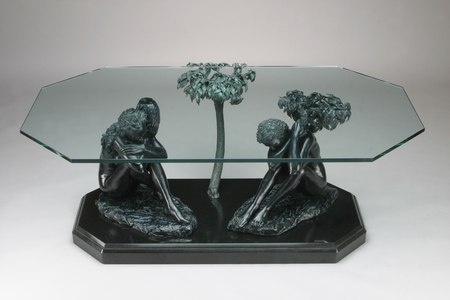 The third element in the work represents the “tree of life” and in addition to providing stability to the glass tabletop, it symbolizes this the greatest of gifts.