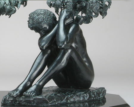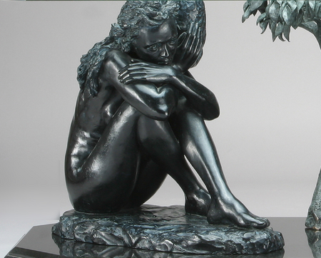 A women holds in her hands a tree representing the behavioral regulations that society imposes upon her. She has lowered her head in submission, her face hidden in the arms that support the symbol of her burden. The apple tree alludes to the story of Genesis; of paradise lost to man by the actions of a woman, and speaks of the responsibility for the original sin; and the disobedience to God. “God expelled both of them from Heaven to earth,” and bequeathed their sin to all of their descendants, as God had never forgiven their disobedience.” Thus, Eve bears the responsibility for herself, as well as for Adam, and the “original sin” of all humanity.