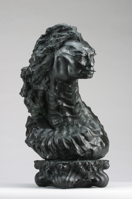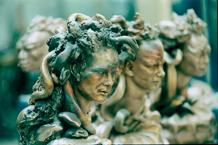 According to myth, Medusa was one of three sisters whose charge was to guard the entrance to the underworld. It is said that they were a race of warlike women who turned to stone all those who beheld them. Still others say that Medusa was a beautiful woman with magnificent hair, an equal to Athena in beauty. This legend tells of how Poseidon seduced Medusa in the temple of Athena and to punish this act, Athena changed Medusa’s hair into snakes. Later, Perseus was sent to seek her out and return with her head. This series of sculptures portrays an imaginary process in which Medusa transforms in order to defeat her enemies and protect her domain.