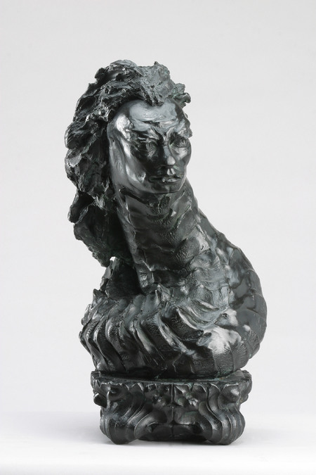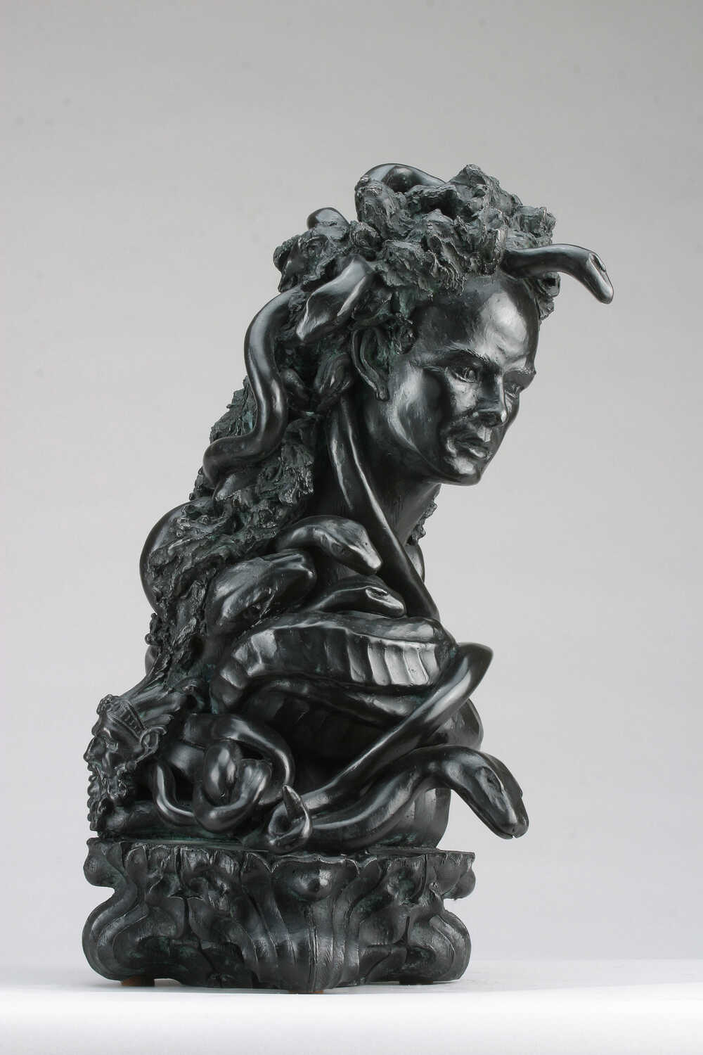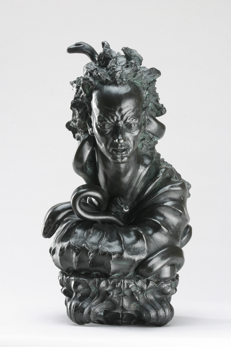 The sculptural work depicts the metamorphosis of Medusa in four stages as she turned from woman to monster. Beginning with a conventional image of a handsome woman, whose hair is adorned with snakes, as described in the early myths. The serpents around her gradually become less abundant as she absorbs them into her changing persona.