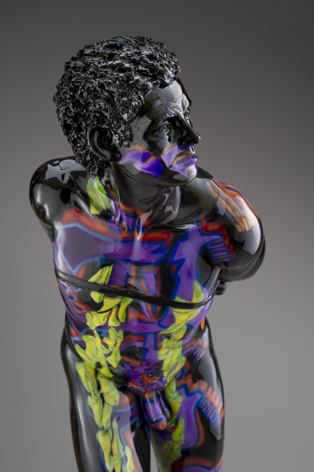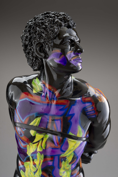 The rebellious energy is apparent in the pose chosen for the Captive, as he turns towards an intolerant society. With his hands restrained behind his back and attached to a strap surrounding his chest denying him the oxygen required for freedom.