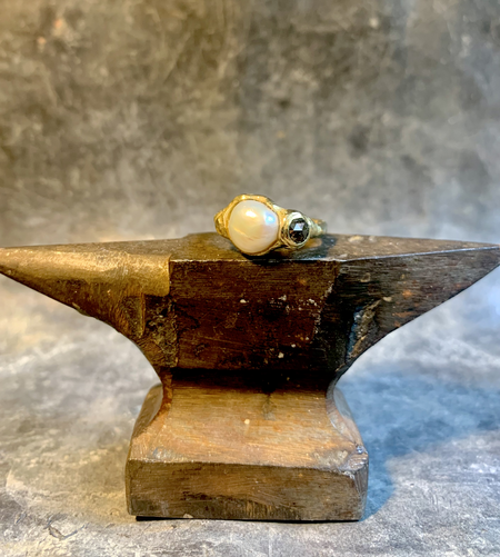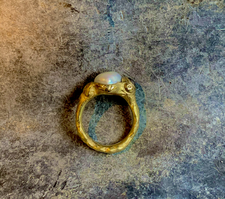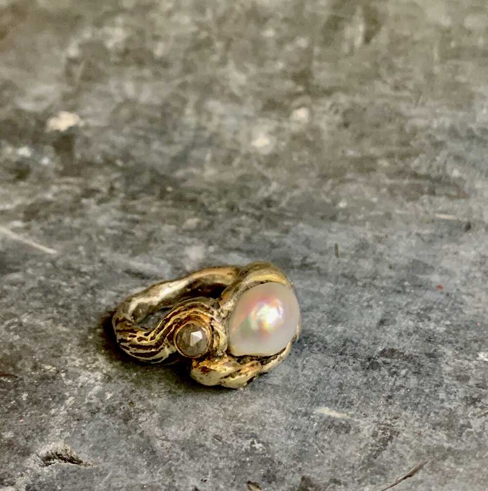 This ring is a combination of silver, gold, salt and pepper diamond and baroque pearl.