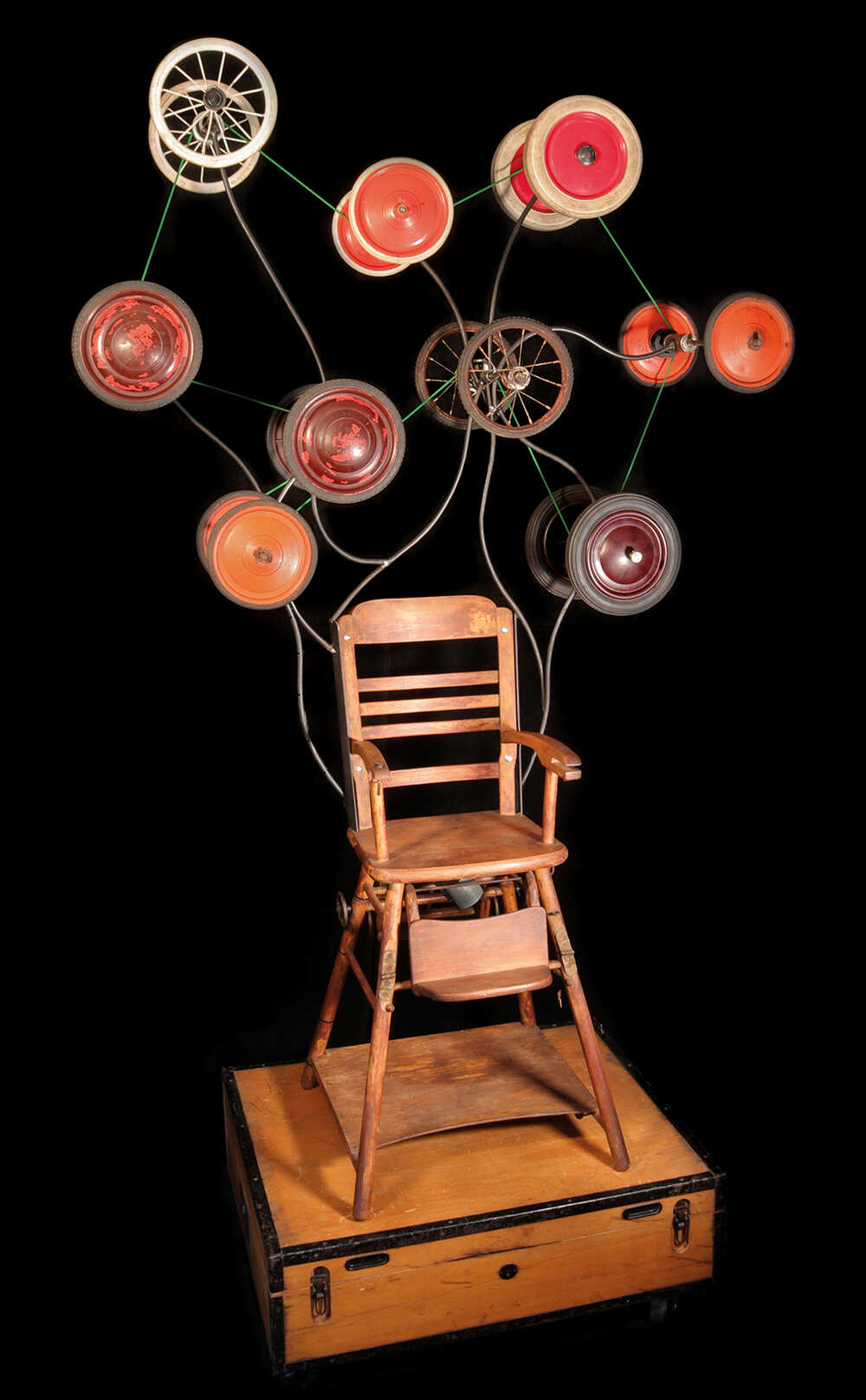 Auf einer Holzbox trohnt ein historischer Kinder-Hochstuhl. Unterhalb der Sitzfläche rotieren zwei Teddybär-Brummstimmen, die jedoch eher an das Blöken von Schafen erinnern. Von der Rückenlehne des Hochsitzes ausgehend ragt ein Gebilde empor aus Kinderwagenrädern, darunter vier Speichenräder, jeweils paarweise auf einer Achse. Das überwiegend rote Räderwerk dreht sich – teils im Uhrzeigersinn, teils gegenläufig.