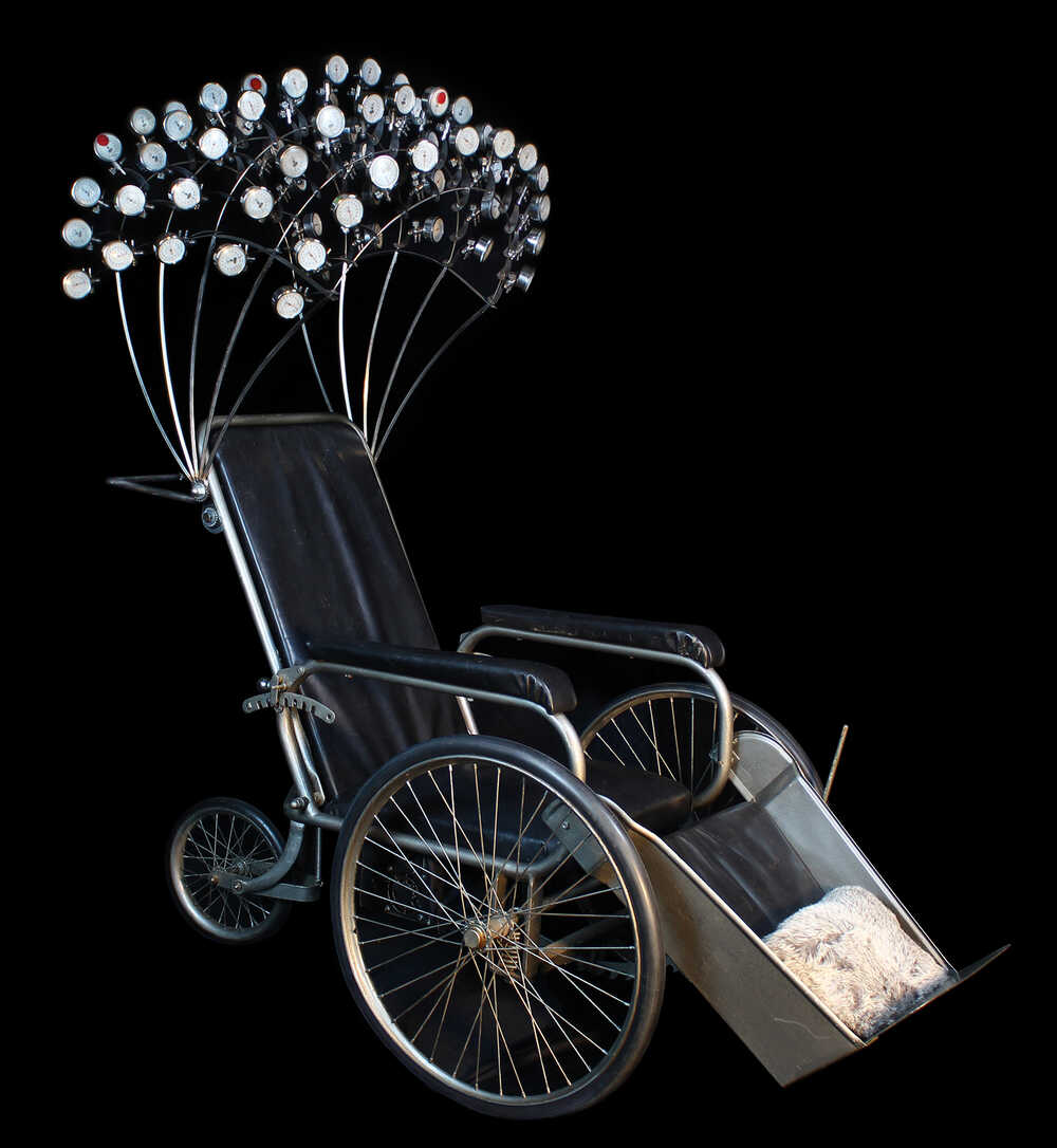 Der Schiebe-Rollstuhl mit seiner majestätisch hohen Lehne wirkt geradezu, als säße noch immer jemand darin und schaukele versonnen pendelnd hin und her, ein wärmendes Fellkissen auf den Füßen. Wie ein würdevoller Baldachin ragt ein schirmartig gefächertes Konstrukt aus fünf Bögen mit je zwölf Aneroid-Manometern über das imaginäre Haupt. Diese Haube aus medizinischem Zubehör erinnert an die falt- und klappbaren Verdecke von Rikschas, vor allem aber auch Puppen- und Kinderwagen.