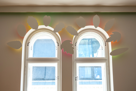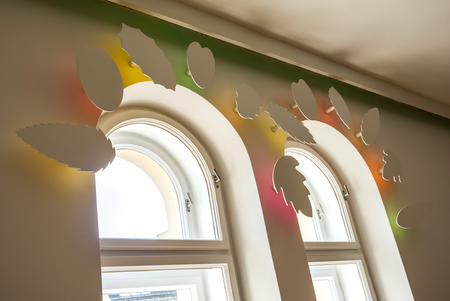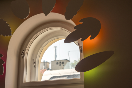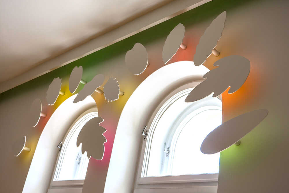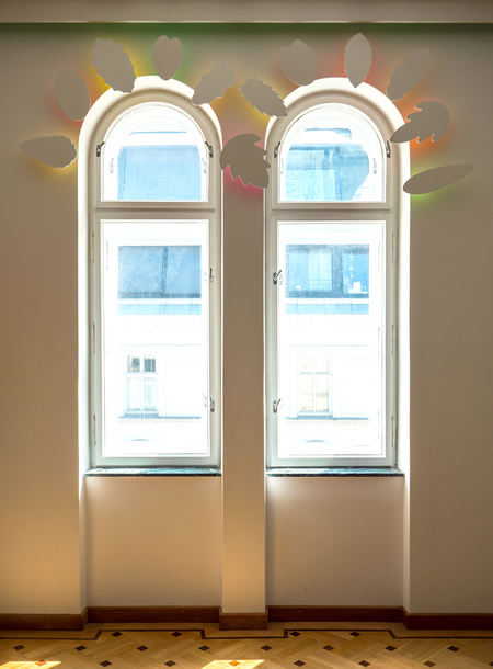 Sie leuchten besonders kräftig, da dicht am Fenster das Tageslicht direkt auf ihre bemalte Rückseite trifft und die Herbstfarben auf die Wand werfen.