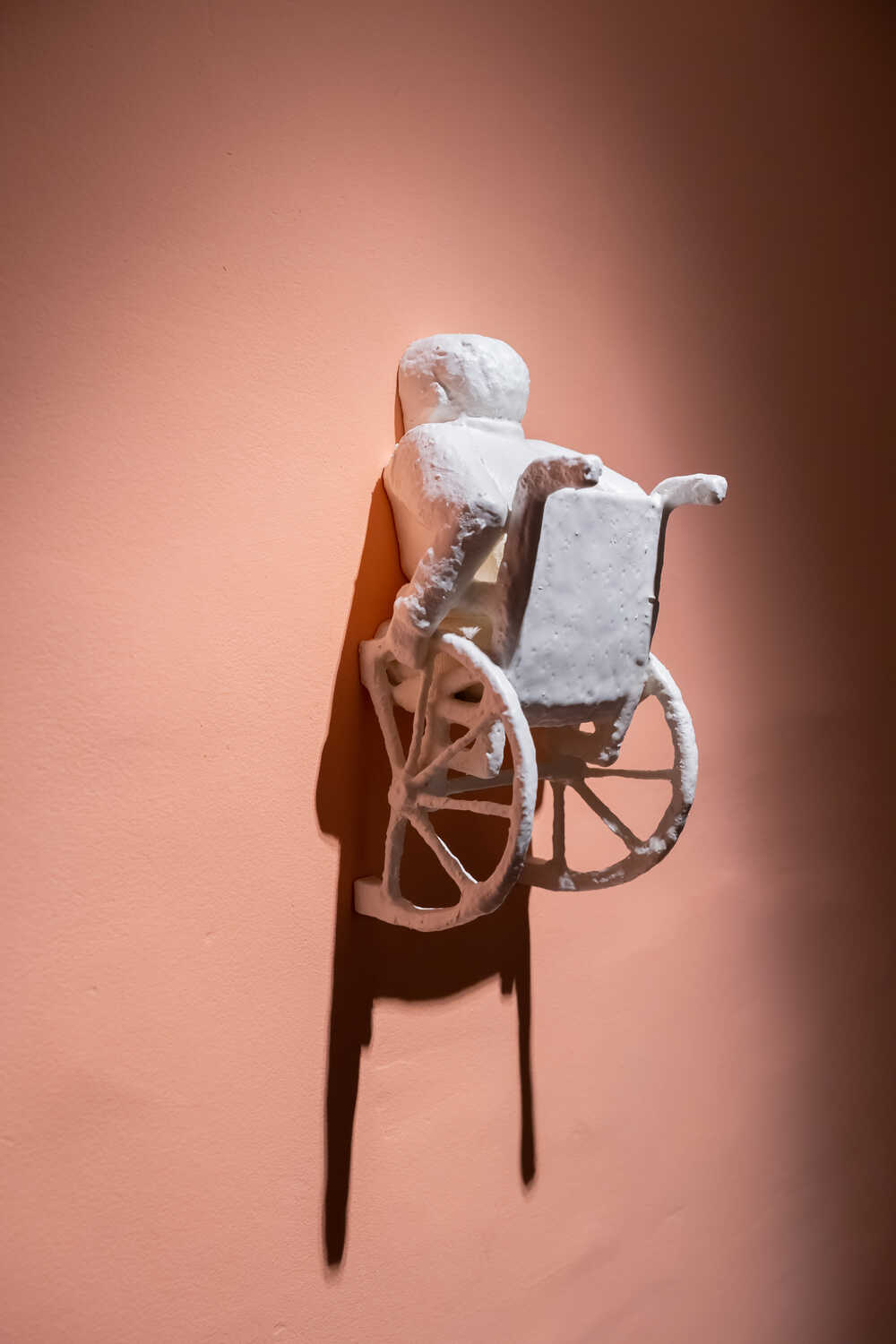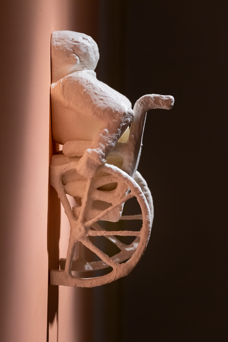 The predominantly monochromatic white sculptures show, in essence, an expressive simplicity, they nonetheless bear an extraordinary air of significance. The works achieved their current form through the artist’s development from more colourful, epic scenes through the harmonizing of traditional sculptural motifs to their present “OFF white” format of material and thematic reductions. The character of the works can evoke the sensation of almost overwhelming frankness, but this allows us to pinpoint them with a degree of certainty and subsequently auto-interpret their multiple layering within a psychological framework based on lived experience. The viewer becomes an observer of human destiny, perhaps helping them to understand their own fates.