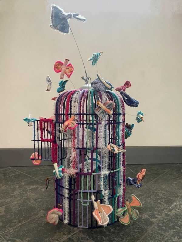 Material: metal, wire, wool (crocheted), from the series: "Butterflies cannot be caged".