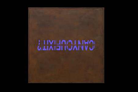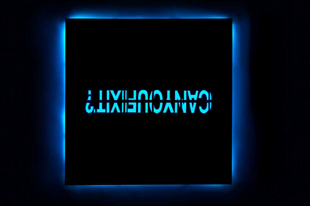 In the realm of minimalist art, where form meets meaning, a striking sculpture emerges, poised to shift our perspective. A rigorous Euclidean form, cast in black steel, it defies gravity, hanging upside down. Within its stark frame, the bold question is etched: "CAN YOU FIX IT?" Light gracefully emerges from these words, like a beacon of hope, transcending the sombre and embracing the transformative.