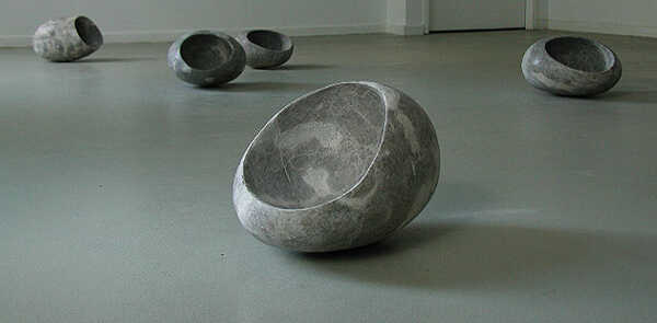 Stein gilt oft als Metapher der Stille, als tote Materie. "Bubbles" lässt jedoch fünf organisch geformte Steine, die an einer Seite geöffnet und ausgehöhlt sind, lebendig erscheinen. Obwohl das Material sehr hart ist, wirkt es durch seine wolkige Struktur eher weich. Und obwohl die Öffnungen wie Münder wirken, ist der Laut, den sie sichtbar von sich geben, wie eingefroren. Werden die Steine jedoch angestoßen, bewegen sie sich hin und her und geben dabei Geräusche von sich. Die Spannung der Gegensätze von hart und weich, von laut und leise, von starr und bewegt bietet einen emotionalen Zugang - es entsteht ein Dialog zwischen Materie und Betrachter.