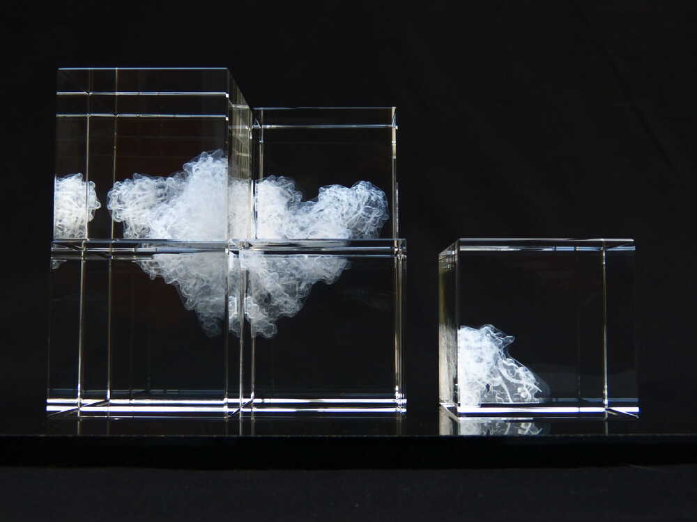 I laser-etch the various layers of the Trimer, down to the smallest molecular level, into 8 separate blocks. When put together, these make up the trimer as a whole.