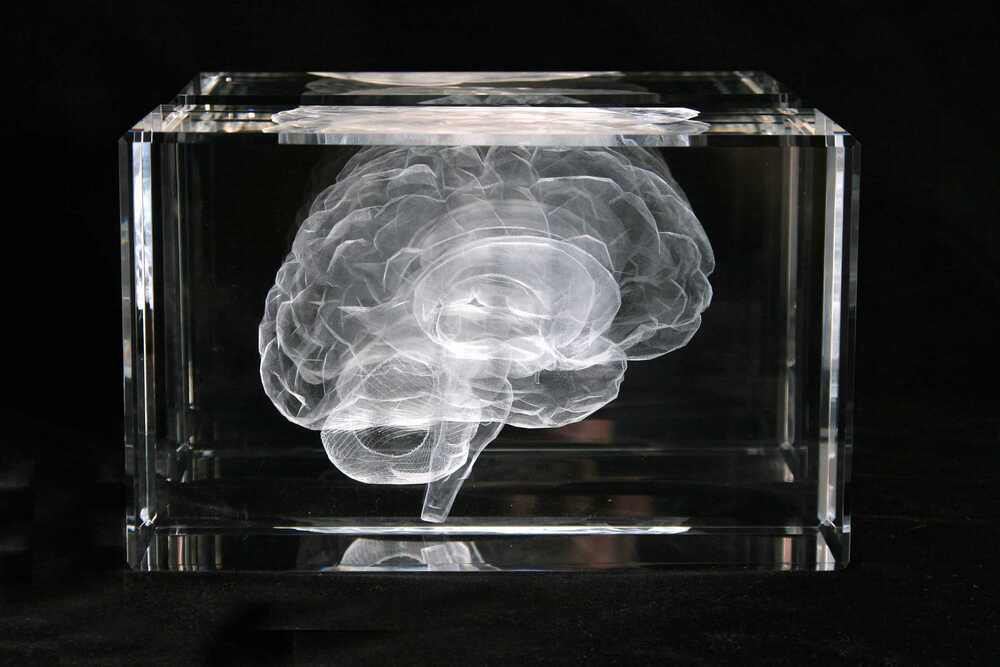 In 2004, as part of research into dyslexia, at Newcastle University UK, I had my head scanned with an MRI. From those images I made various works, including My Soul, a laser etched image of my brain. It is life-size, with the left and right hemispheres in two separate blocks of glass.Â