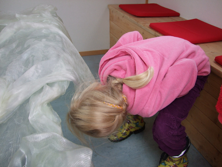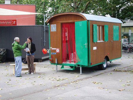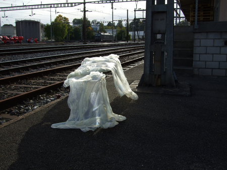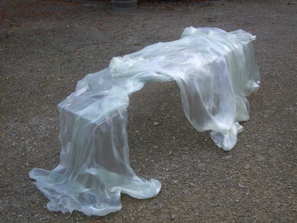 "The circus wagon turns out to be hearse, a death chamber, a rooom of abdication - a place of saying goodby, of grief and contemplation. Vera Staub carries with her two artworks dealing with the process of dying. The congealed shroud references an absent coffin (the so-called "pregnant coffin"). Thus connecting void and plenitude, it becomes a paradoxical object. Furthermore, the shroud undermines the laws of rationality; what is supposed to cave in, remains erect as an elegant scuplture - possibly a symbol of the mysterious white woman who figures in the nursery rhyme "Romperemos un pilar"?"