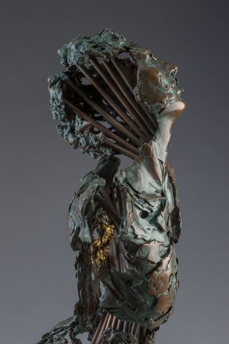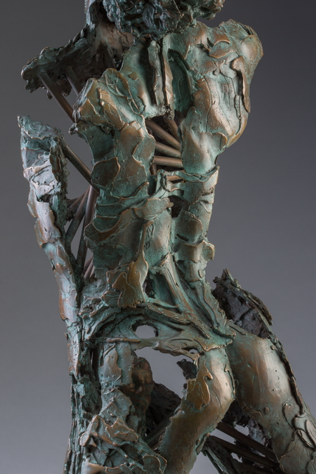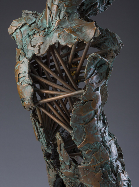 Aquariel reveals some of the mysteries of our human condition. The engineered structural interior of this work nuances the elements of intellect, personality and spirit, evolving into our inner most selves. Finally they resolve into our story, formed from something hidden within us, a decisively special part of who we are united with the idea of “spirit”, each becoming more evident and finally binding with a concept of soul. These remnants of ourselves slowly advance endowed with compassion and sheltered behind our surface of bronze armour
