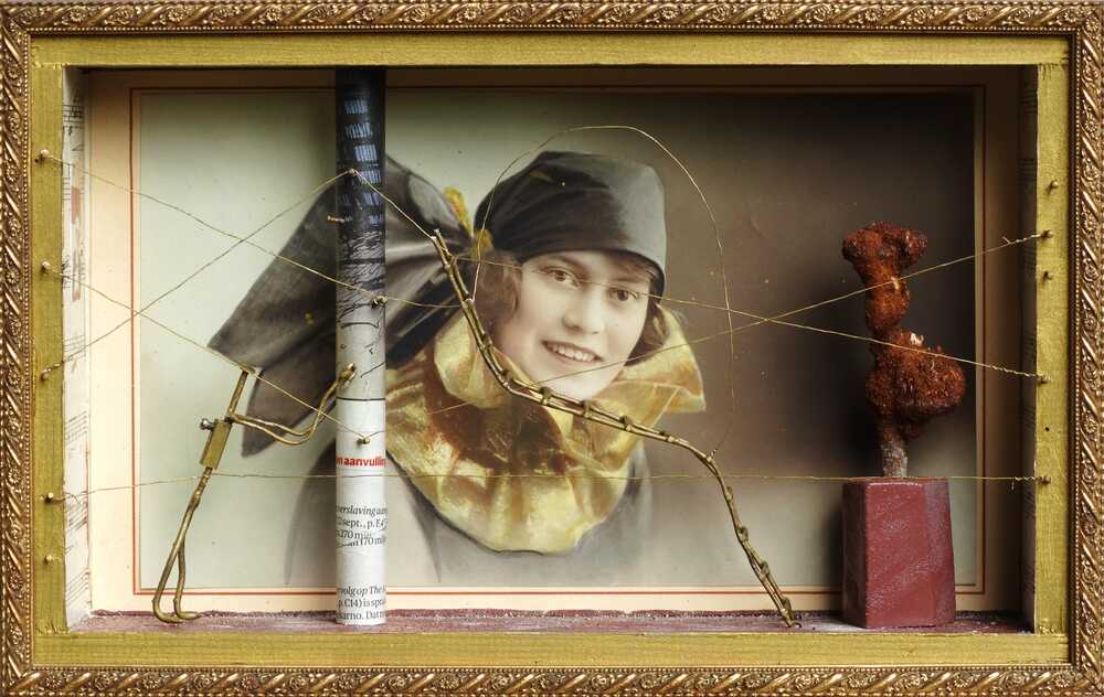 (Three-dimensional, box-assemblage, inspired by Joseph Cornell, material board, photo, iron, sand, acryl-paint, found object)