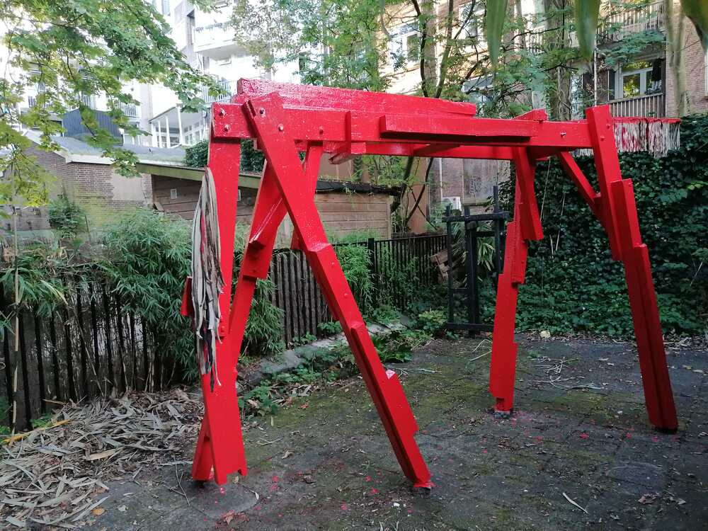 Red sculpture 2023 hergebruikt hout-textiel 330cm