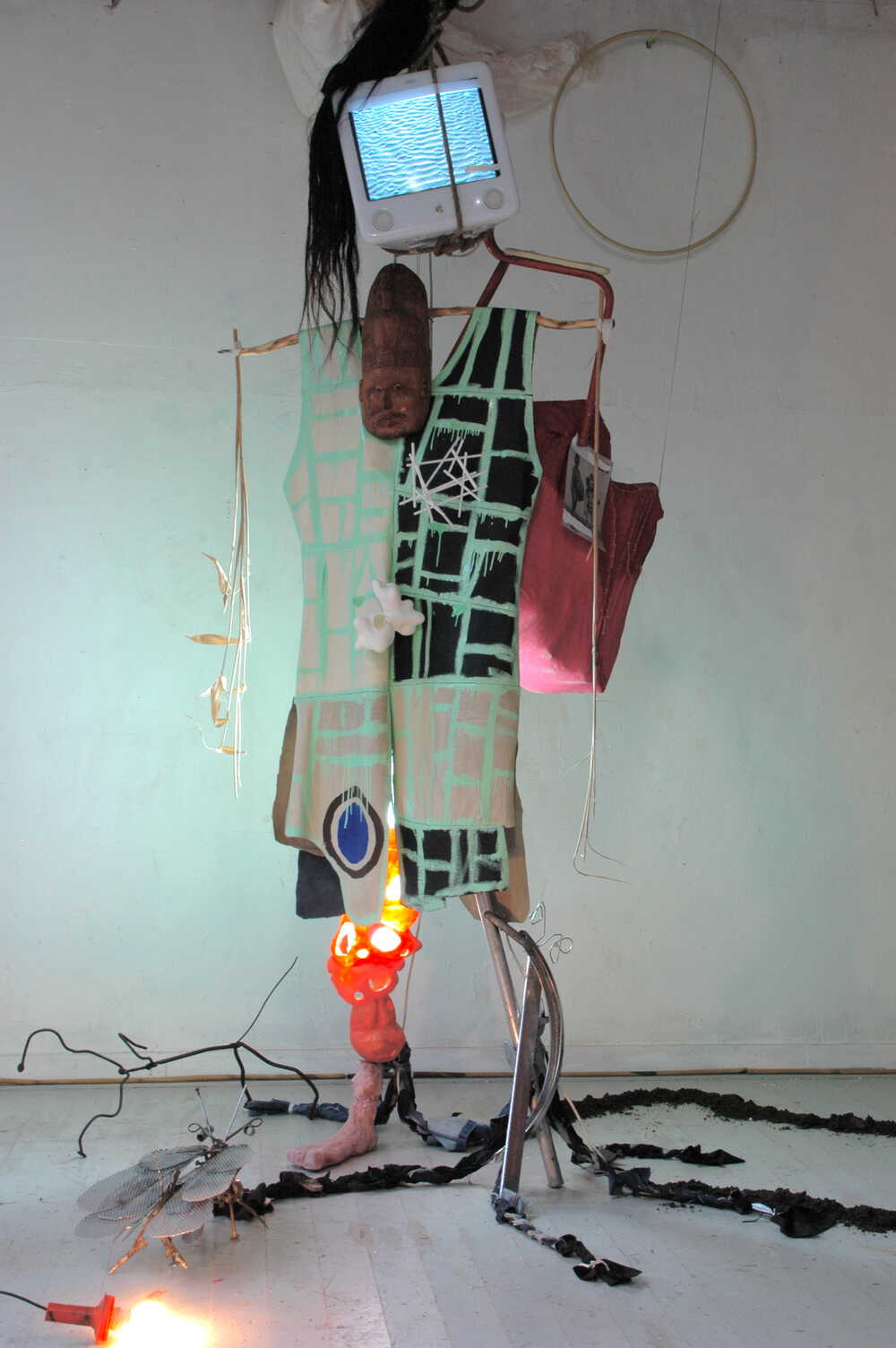 - sculptuur Jump-over t werk van Rosie Braidotti-leer-3 d print-oud masker uit Nieuw Guinea-staal-jeans-applecomputer
