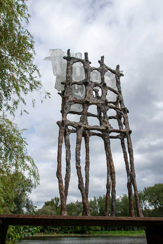 This sculpture is number five in a serie of achitectural objects inspired on a natural way of building. The bronze is cire perdu and the glass full casted in moulds.