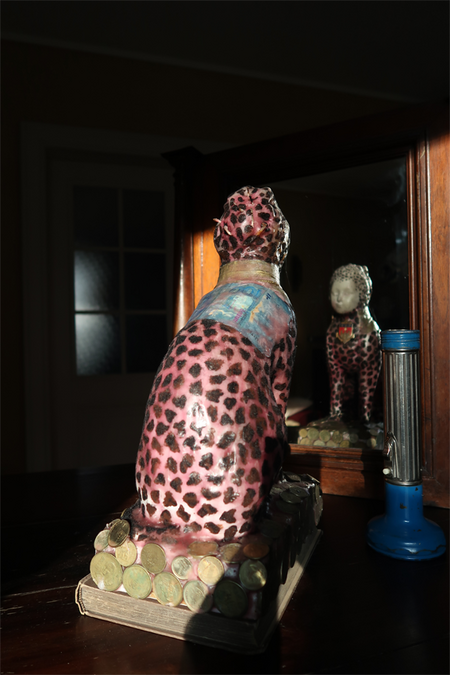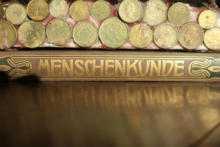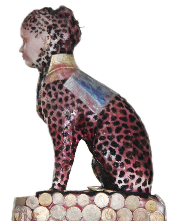 The dangerous ancient Greek sphinx as a winged lioness with a woman's head has become a cute cat woman sitting sleepily on the book "Menschenkunde". She is saddled with a 100 Deutschmark note with the portrait of Clara Schumann, which has been coloured blue. Soft wax was covered with black velvet spots. Seven wicks protrude from the back of the head, which are ideal for lighting. Then only the hard money would remain.