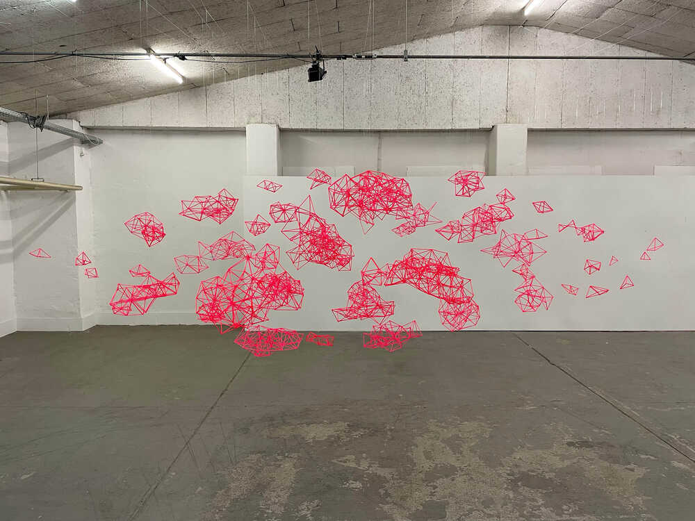 Dozens of luminous structures made from meticulously assembled cake pop sticks float in a pink cloud in the room. The various elements represent the data that we entrust to the digital cloud. The boundary between the digital and the tangible is blurred and symbolizes the profound changein the way we deal with information. Walking through the floating paper cloud evokes a feeling offeeling of connectedness and emphasizes the fragility of our digital connections and the connections and the responsibility to preserve their integrity.