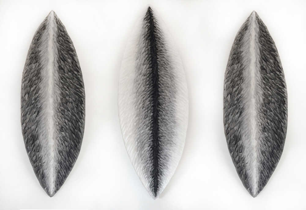 Installation with three paper objects made from japanese paper. The feather-like structure of the surface consists of delicate hand-dyed and torn pieces of paper.