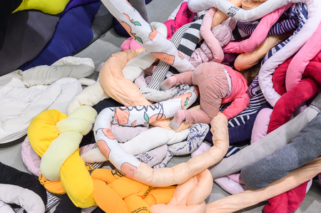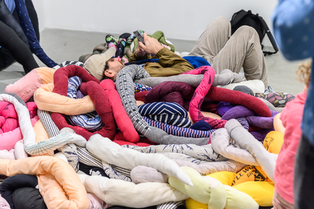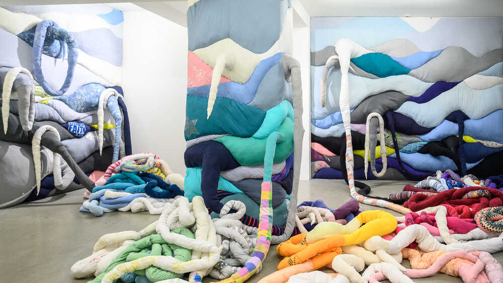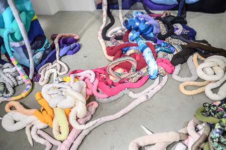 The solo show project utlizes leggings and sleeves cut from clothes gifted to the author. The result is an immersive interactive installation, which takes up the whole gallery space. Visitors are free to play and transform the space, or just sit and relax in it.