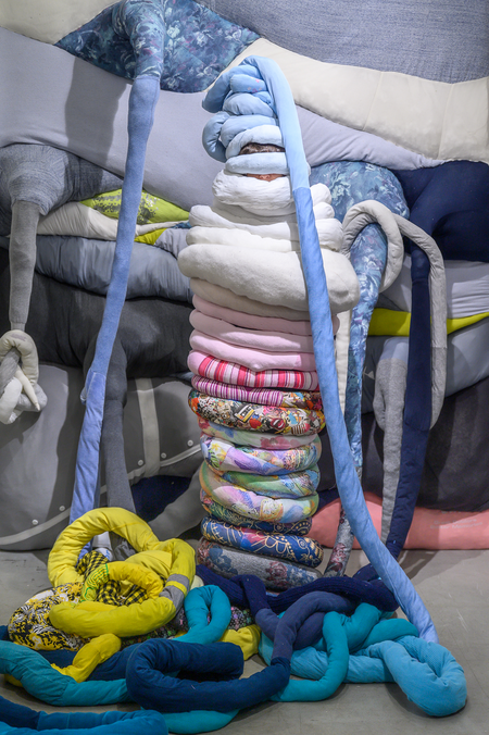 donated textile, second-hand stuffing, MDF plates, wood, clothes rack. Variable dimensions