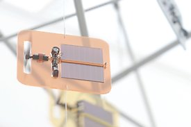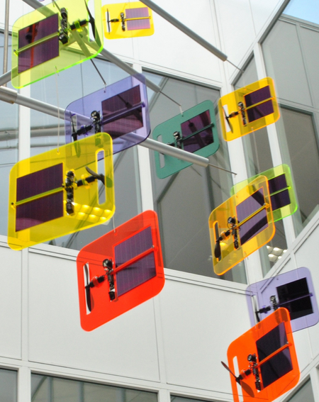 135 of these mini-solar sculptures generate electricity themselves and convert it into motion. They float unpredictably in the air in the new Alliander building. This kinetic mobile is 13 meters high and has a diameter of 9 meters. In the morning it slowly comes to life, during the day it is lively and when the sun sets it slowly comes to rest. It is like a musical instrument that is played by the sun.
