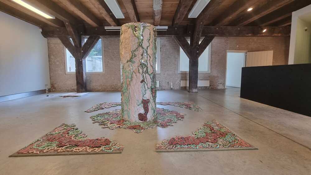 Used carpets form the ground, they open a new path. At the same time, they refer to a time when the economy seemed capable of growing to the sky; the reconstruction in which industrialization really got underway. We are now seeing the disastrous consequences of this.