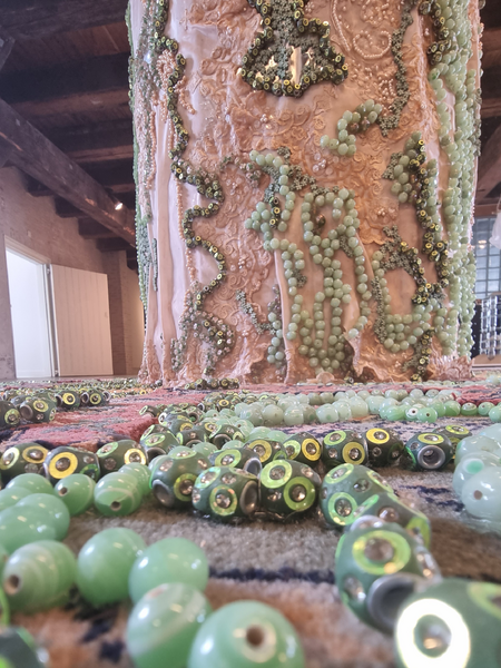 Then came the beads that proliferate over the aluminum protective layer like moss, fungi or bugs and seem to be looking for a passage to digest the trunk. The beads symbolize our consumer society.