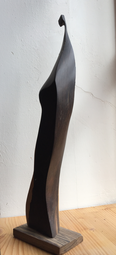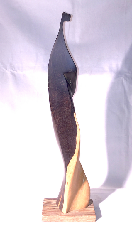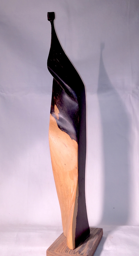Freie Form mit einer angedeuteten Fahne an der Spitze. Extrem hartes und schweres Grenadill-Tropenholz. Scharfer Kontrast zwischen dem schwarzen Kernholz und dem hellgelben Splint. Holz geschliffen, poliert, gewachst. FuĂź: Wenge (kann ausgewechselt werden ).