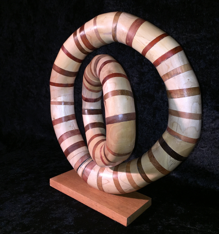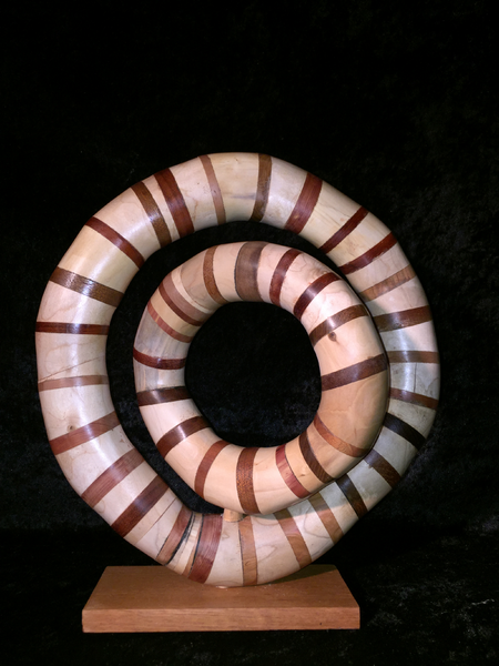 Zwei Ringe, zusammengesetzt aus verschiedenen Hölzern stehen ineinander und sind gegen einander drehbar. Die Hölzer sind geschliffen und poliert. Fuss: Brasilkiefer