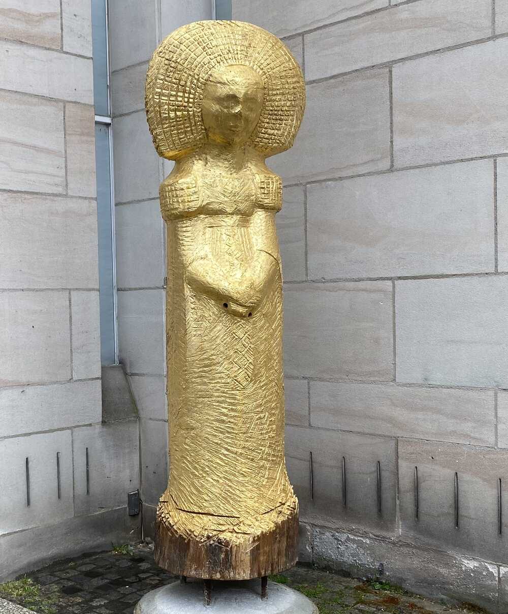 Mit Blattgold 24 Karat vergoldet strahlt das Kruseler Püppchen auch an Regentagen. Vorne mit Fluglöchern ausgestattet und hinten mit Flügeltüren und einem ausgeklügelten Beutensystem, hält es den Anforderungen moderner Imkerei stand. Hier vor dem Nürnberger Spielzeugmuseum, in dessen Räumen auch das Original 12cm hoch und aus Pfeifenton geformt steht wurde es lediglich vergoldet, sie sucht noch nach einem Liebhaber und schließlich auch jetzt nach einem Schwarm, der ihr den Bauch wärmt.
