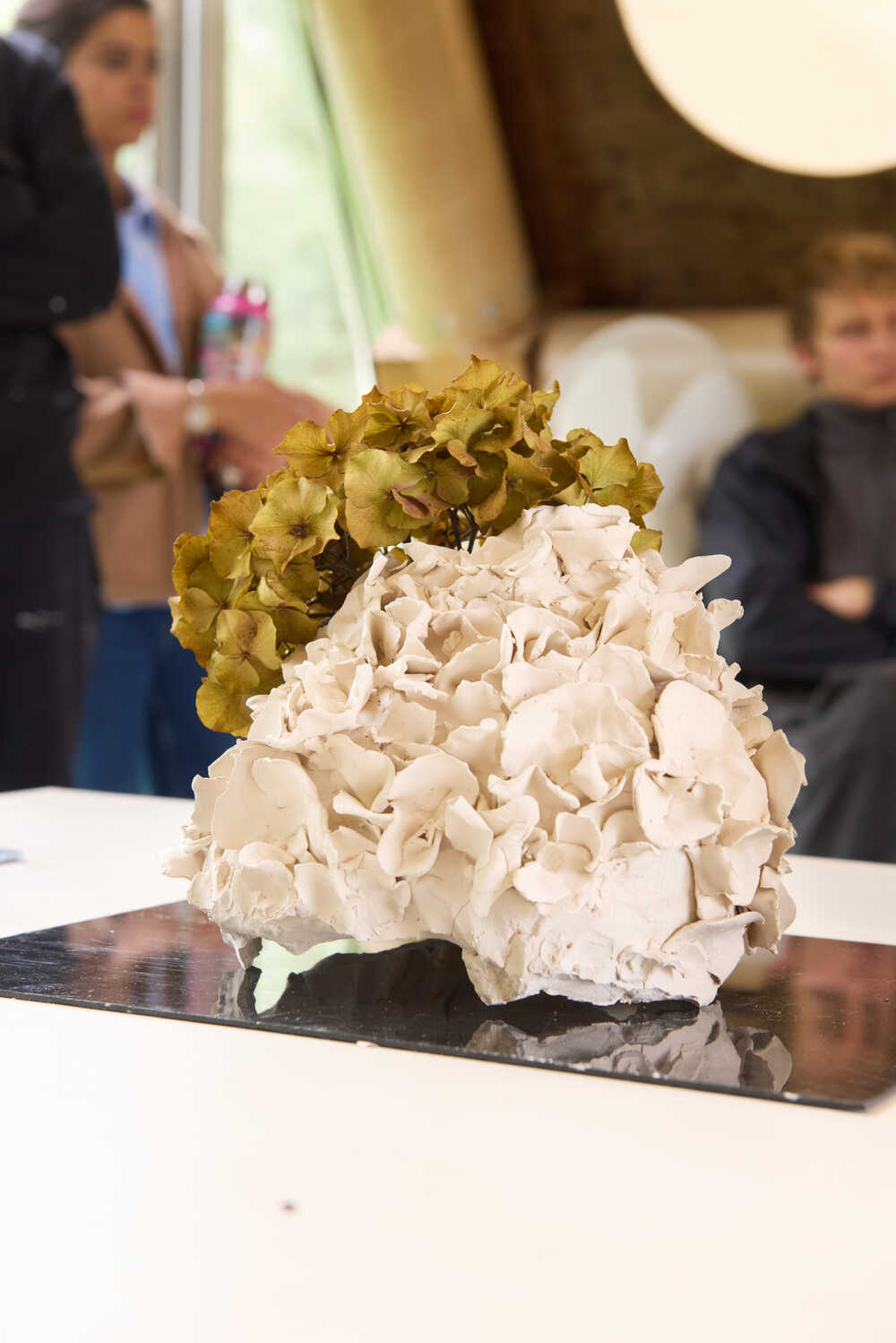 Die Skulptur verbindet handgefertigte, aus Ton geformte Blütenstrukturen mit einer echten, getrockneten Hortensienblüte. Inspiriert von der floralen Ästhetik, entsteht ein spannendes Zusammenspiel zwischen der künstlichen Nachbildung und dem organischen Original. Die weichen, abstrahierten Formen aus Ton fangen die Essenz der Blüte ein, während die natürliche Hortensie die Skulptur mit einem Hauch von Realität vervollständigt. Das Werk lädt dazu ein, die Grenzen zwischen Natur und Kunst zu hinterfragen und das Zusammenspiel von Materialität und Vergänglichkeit neu zu interpretieren.