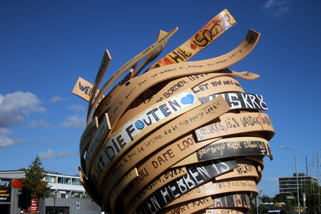 Social sculpture – What began in 2013 in part of the Van Abbemuseum called ‘Het Oog’ with text by Fresku kept flowing on with Tante Netty into more than 30 workshops. It swarmed and raged on gathering wooden boards written on by more than 600 (!) people in Eindhovens neighborhood Woensel. Now here it is: The WoenselSupertoll! A huge spinning top in the middle of Woensel. We say ‘Eindhoven the craziest’ and WoenselSupertoll!